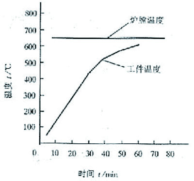 由于该工件厚度较厚,体积较大,采用硬加热规范,把炉膛温度预置到650℃,然后把安置好钎料和钎剂的工件放入炉膛进行加热,待工件温度上升到600℃即可出炉冷却。图3为炉膛和工件温度与时间的变化曲线。2.3 焊后清洗  钎焊后的工件在20%左右的硝酸溶液中清洗,可以得到满意的清洗效果。